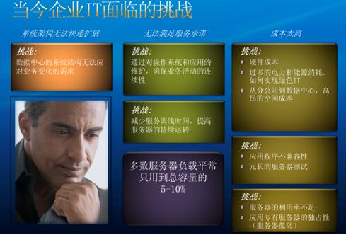 虽然大多数服务器系统资源的利用率在10%-15%,但是构架,安全和兼容性方面的问题导致必须指定不同的物理平台来运行它们。管理,安装补丁和添加安全策略将花去大量的时间。另外,服务器的衍生组件将导致设备,动力和散热方面的成本上升。